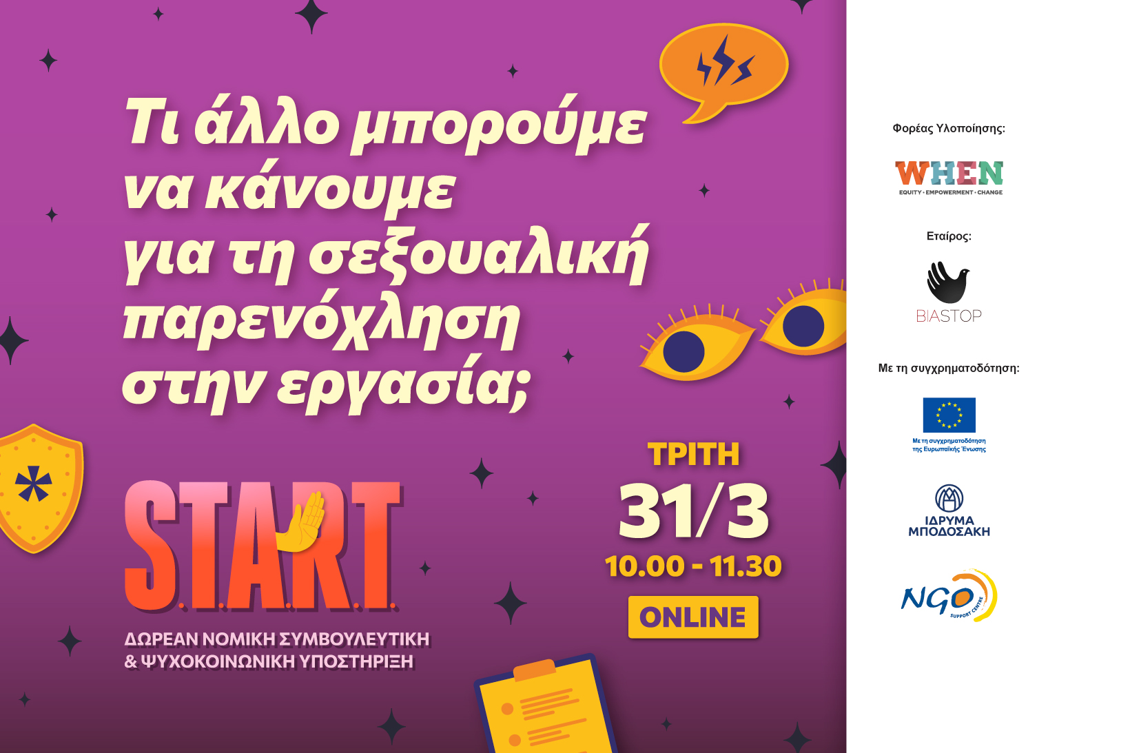 Το WHEN, σε συνεργασία με το ΒΙΑ STOP, διοργανώνει διαδικτυακή εκδήλωση με τίτλο “Τι άλλο μπορούμε να κάνουμε για τη σεξουαλική παρενόχληση στην εργασία;”, στο πλαίσιο του έργου S.T.A.R.T. (Strategic Tools for Addressing, Recognizing and Tackling Sexual Harassment at Work) για την αναγνώριση και καταπολέμηση της σεξουαλικής παρενόχλησης στον κόσμο της εργασίας.