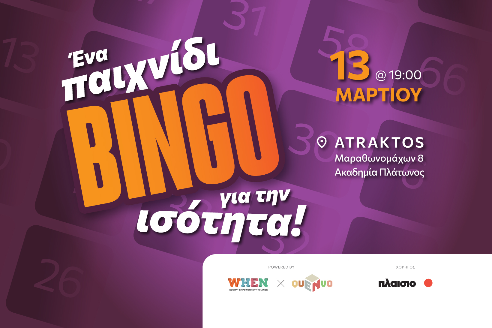 Την Παρασκευή, 13 Μαρτίου από τις 19:00 έως τις 22:00 στην Άτρακτο, το WHEN ενώνει δυνάμεις με την Quenvo και, με την υποστήριξη της Πλαίσιο Computers, σε προσκαλεί σε ένα δυναμικό παιχνίδι Bingo αφιερωμένο στην έμφυλη ισότητα στην εργασία, με γνώμονα την ουσιαστική αλλαγή: στόχος της πρωτοβουλίας μας είναι να συγκεντρωθούν οι πόροι που θα μας επιτρέψουν να συνεχίσουμε και να επεκτείνουμε το πρόγραμμα του οργανισμού για την πρόληψη και καταπολέμηση της σεξουαλικής παρενόχλησης και των έμφυλων διακρίσεων στον κόσμο της εργασίας!
