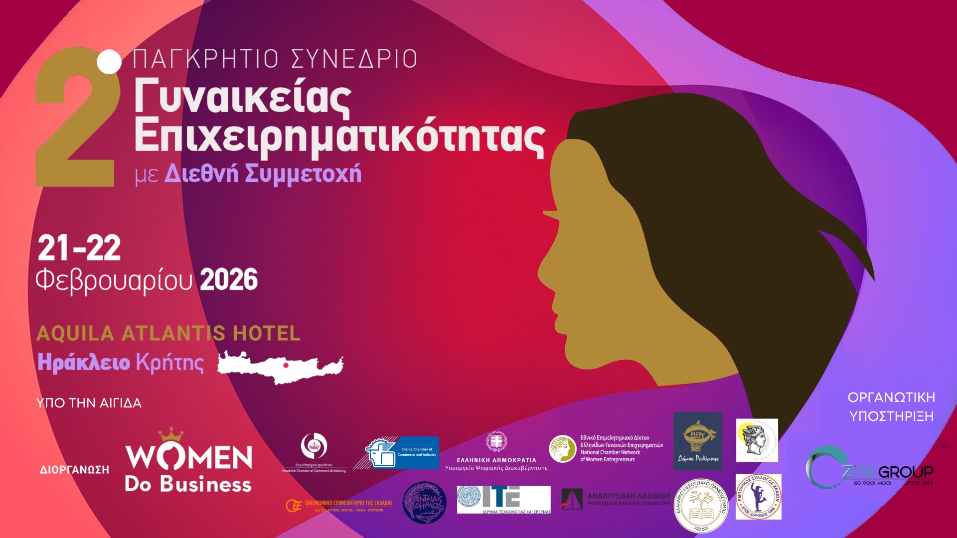 Η Women Do Business, σε συνεργασία με τη ZITA Group, ανακοίνωσε τη διοργάνωση του 2ου Παγκρήτιου Συνεδρίου Γυναικείας Επιχειρηματικότητας με Διεθνή Συμμετοχή, το οποίο θα πραγματοποιηθεί στο Ηράκλειο Κρήτης, στις 21 και 22 Φεβρουαρίου 2026, στο Aquila Atlantis Hotel. Με την ενεργή συμβολή θεσμικών φορέων και επιχειρήσεων, το Συνέδριο έρχεται για να εδραιωθεί ως σημείο αναφοράς της γυναικείας επιχειρηματικότητας.