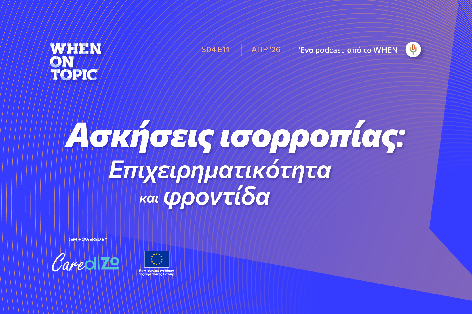 Στέλλα: Καλώς ήρθατε σε ένα νέο επεισόδιο του WHEN on Topic. Είμαι η Στέλλα Κάσδαγλη και σας καλωσορίζω σε μία ακόμη συζήτηση για την επαγγελματική και οικονομική ενδυνάμωση των γυναικών και την ισότητα στην εργασία, καμιά φορά και έξω από αυτήν. Αυτός ο κύκλος του podcast μας είναι αφιερωμένος στις ευθύνες φροντίδας και την ίση κατανομή τους, και όπως ξέρετε, έρχεται κοντά σας χάρη στο CAREdiZo. Τι είναι το CAREdiZo; Είναι ένα ευρωπαϊκό έργο στο οποίο συμμετέχουμε ως WHEN, στο πλαίσιο του προγράμματος CERV της Ευρωπαϊκής Επιτροπής, το οποίο στοχεύει στη γεφύρωση του έμφυλου χάσματος στις ευθύνης φροντίδας μέσω της προώθησης πρακτικών ισότητας στο σπίτι, σε πολύ μικρές επιχειρήσεις και σε μικρούς οργανισμούς της κοινωνίας των πολιτών, δηλαδή επιχειρήσεις και οργανισμούς με έως 10 εργαζόμενα άτομα. Το έργο υποστηρίζει πολιτικές φιλικές προς την οικογένεια, ενθαρρύνει τους άνδρες να συμμετέχουν στη φροντίδα και βέβαια αναδεικνύει την αξία της φροντίδας στην ευρύτερη κοινωνία, ό,τι δηλαδή πρεσβεύουμε και εμείς τόσο καιρό. Οι δράσεις του περιλαμβάνουν έρευνες, εργαστήρια συνδημιουργίας, προγράμματα κατάρτισης και την ανάπτυξη ψηφιακών εργαλείων, όπως ένα εκπαιδευτικό παιχνίδι και podcasts όπως αυτό, για την καταπολέμηση των στερεοτύπων και την προώθηση της ισότητας. Οι υπόλοιποι εταίροι μας προέρχονται από την Κύπρο, τη Λιθουανία και τη Βουλγαρία και αυτή τη στιγμή που μιλάμε δημιουργούν τα δικά τους podcasts, τα οποία ίσως έχετε την ευκαιρία να γνωρίσετε σε λίγο καιρό.